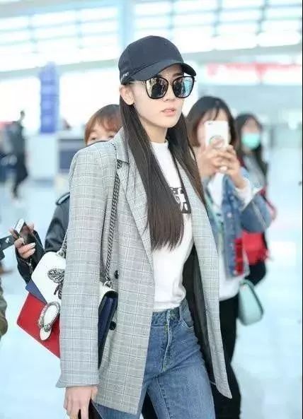 干练的西装外套内搭T恤,下搭牛仔裤,气场爆棚。