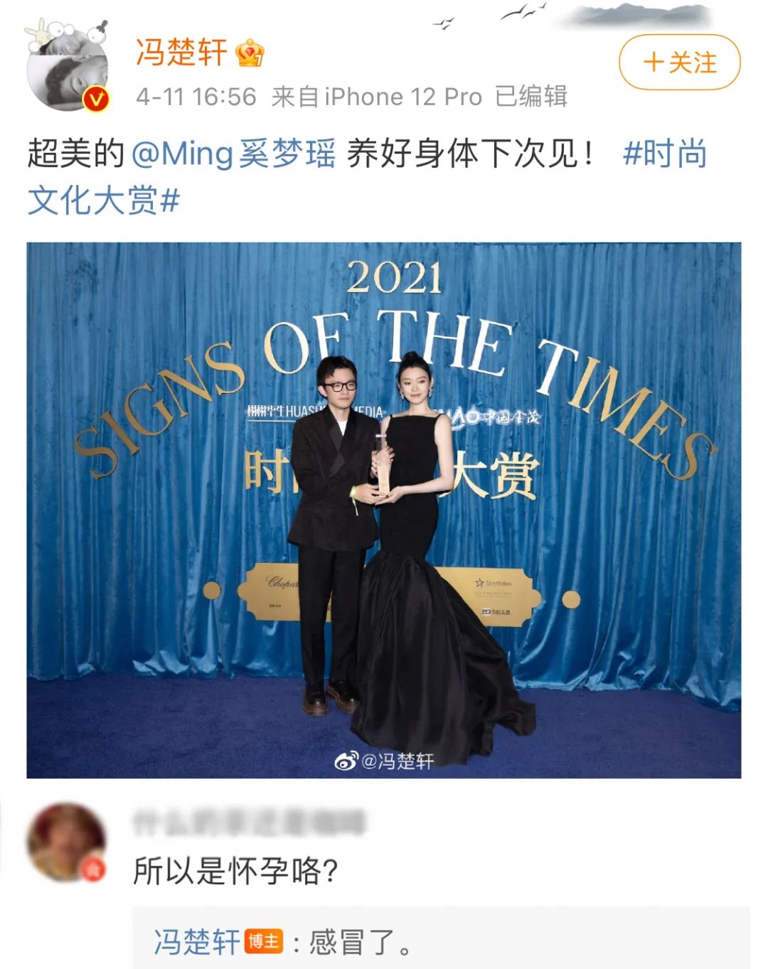 时尚主编冯楚轩晒出与奚梦瑶合照,让她养好身体下次见,顺道帮她澄清只是“感冒了”。