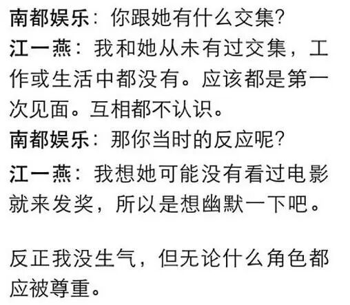去年华鼎奖江一燕拿了最佳女配,然后颁奖嘉宾是余文乐和薛凯琪,然后薛凯琪问余文乐:"什么是好的女配?"余文乐说要低调,不能抢女主风头。然后薛凯琪说那江一燕在《四大名捕》不就很好了?因为我们根本看不到她的脸"