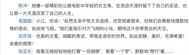 不少明星都为她写了推荐语,包括刘亦菲高圆圆张亚东陈道明等,还有《天浴》的导演陈冲▼