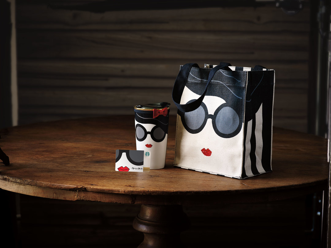 这套限量版的设计主要以 Stacey Bendet 的卡通自画像为主题,Stacey Bendet 留着黑发、戴着时尚墨镜并搭配大红唇,用黑红两色和可爱的形象把马克杯、环保袋以及星享卡填满。