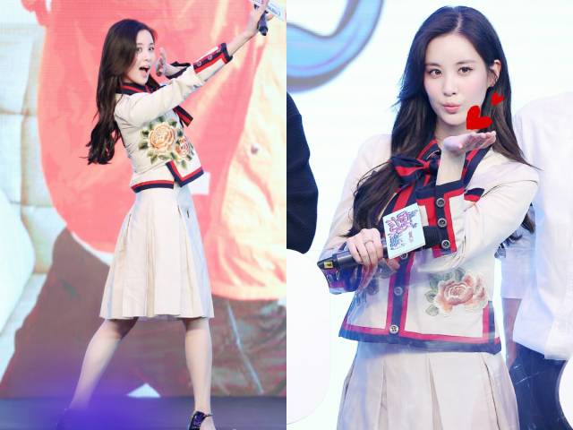 再来看徐玄,玄女神的小套装穿搭更多了一些可爱小女生的风情,这套Gucci套裙,灵动柔美,少女气息十足。