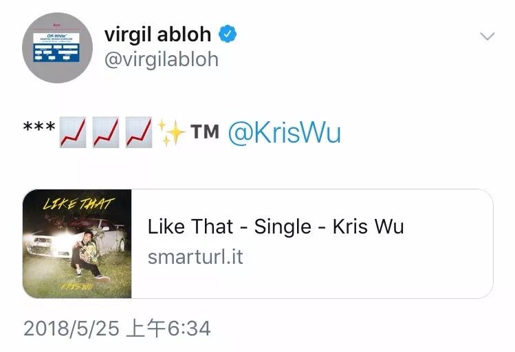 为 Burberry 代言并走秀,成为时装周的常客,与大牌设计师合照宛如家常便饭,就连 Vrigil Alboh 也是他的圈内好友,Kris Wu 新歌一发布便转发分享,以表支持。