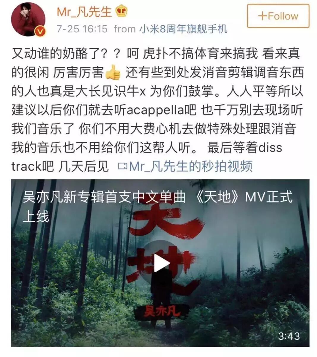 第二波高潮是吴亦凡本人在微博上怒怼虎扑!回怼的同时还顺带发了自己的MV,这波操作可以说很6了。
