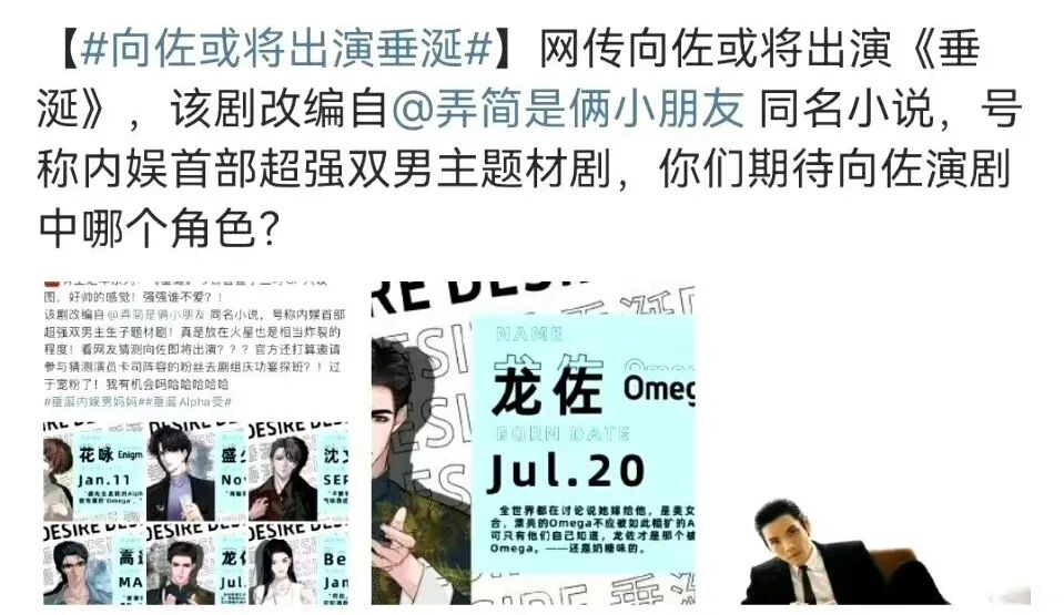 今天有个网传向佐或将出演《垂涎》的消息,剧是改编自同名小说,有一定粉丝基础,好像还号称是内鱼首部超强双男主题材剧,如果有看过这个小说的瓜友可以来聊聊向佐到底合不合适。既然这次能传出这个消息,大概率应该是处于接触状态,有时突然放个消息也带着试水的意思,不过眼下网友似乎并不是很买账,有的甚至嚷着看他不如看他老婆郭碧婷拍戏呢。