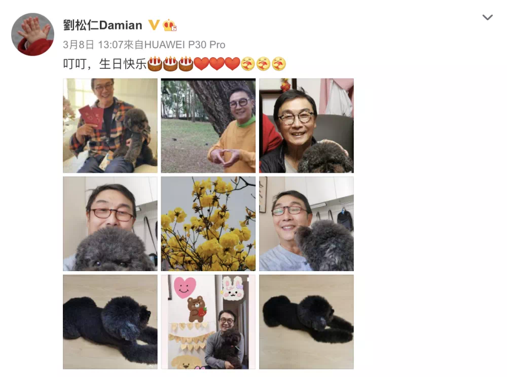 3月8日,71岁的刘松仁在社交平台发布了几张照片,为爱犬叮叮庆生。