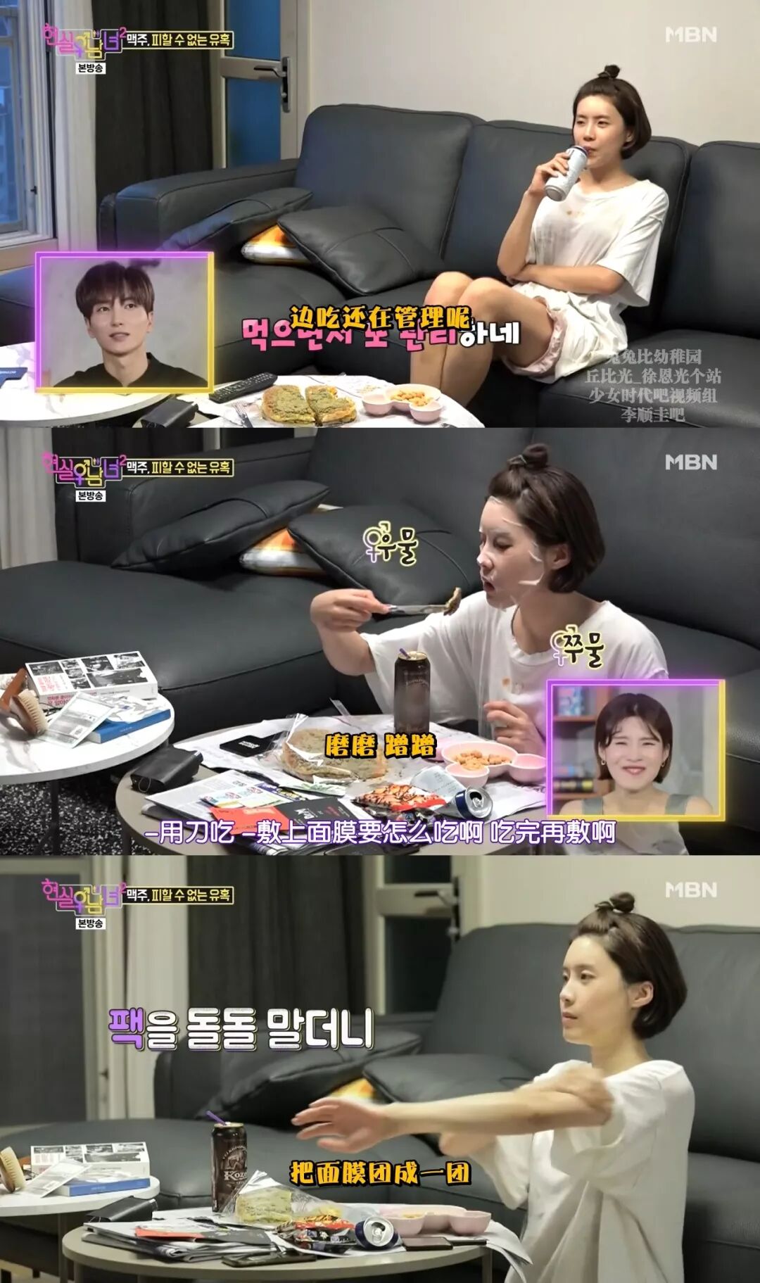 喝了酒容易缺水,所以做个面膜,边吃边做的面膜,面膜这种东西不能浪费,最后从脸上扯下来就把胳膊、脖子啥的都给擦一擦,做到不浪费