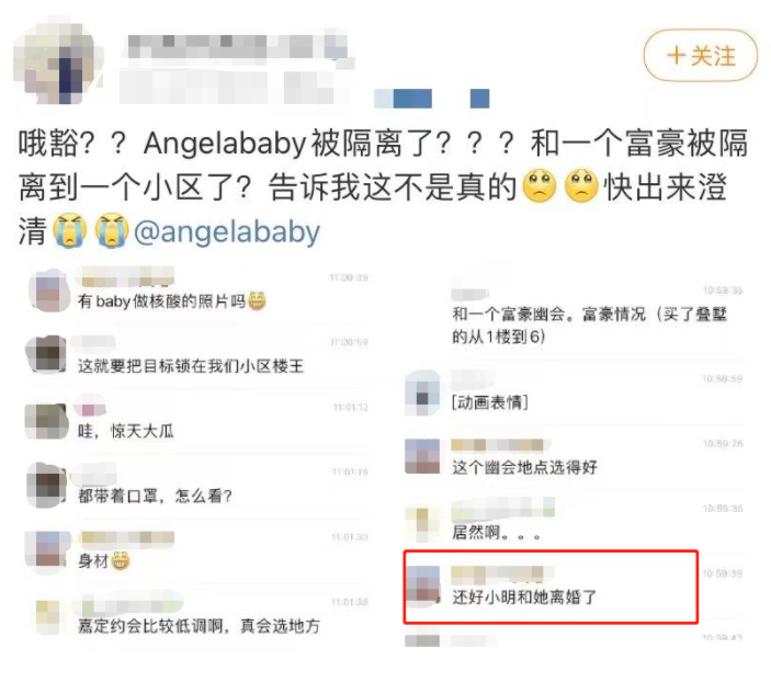 爆料说的有鼻子有眼的,称Angelababy与富豪在嘉定约会,结果因为疫情导致被隔离,只能呆在了某富豪的家里,连富商的门牌号都安排好了。