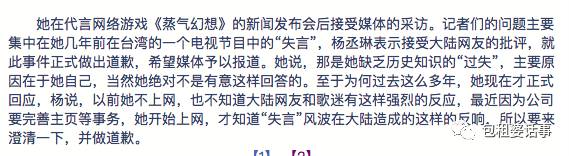 在2006年出席上海的一个网游发布会中,因为在场的记者突然发问,她又再次郑重道歉,表示这是她当时年纪轻、口无遮拦,在后面的专访环节她也一再解释是自己的历史没学好,是她做错了。