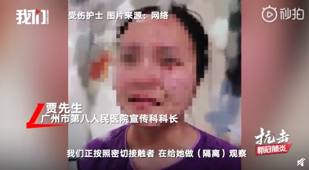 4月1日7时,广州第八人民医院住院部一楼隔离病区有一名外籍新冠肺炎确诊患者不配合治疗,并将女护士打伤;护士被外籍患者推倒在地殴打并咬伤脸部。事情发生后,很多护士发朋友圈被医院领导邓主任骂。