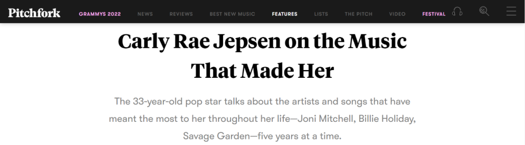 “我觉得一天应该开始得更轻松一些。”Carly Rae Jepsen这么向我承认道,她觉得她当闹铃用了一年半的那首歌有点太悲伤了。“那是一首Dev Hynes的歌,我真的很喜欢,但是这首歌也真的很伤感。”她这么说道,而后深吸一口气,疲倦地唱着《With Him》开头的那几句歌词:“You chose to stay away from me/I chose to try to let you in.”她脱下外套,在曼哈顿一号世贸中心的沙发上舒适地坐下,又补充道:“每天早上我都会很大声的跟我男朋友说‘我要把闹铃换掉!’”但是随着我们有关Carly童年时期最爱音乐这一话题谈话的深入,我渐渐觉得她选这么深沉的一首歌当闹铃好像也没那么奇怪了。“我在两个不同的家庭中长大。”这位来自加拿大不列颠哥伦比亚省的歌手这么介绍自己,她的父母在她五岁时离婚了,并且随即各自组建了新的家庭。她的母亲很爱听Joni Mitchell和Leonard Cohen,而教会Carly弹吉他的父亲则更喜欢John Denver和James Taylor。而后来,随着Carly和祖母的关系越来越亲密,Billie Holiday和Chet Baker这样的爵士歌手也被加入了她的歌单。在她的四位父母中,只有她的继母Patti最爱《Call Me Maybe》式的洗脑流行乐。当Carly和继母两个人共度夜晚时光的时候,她们会穿上皮裤扎起马尾辫,听着Janet Jackson、Paula Abdul和Donny Osmond跳舞。