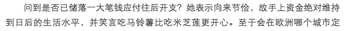 有的人会说,那是因为她有钱啊!关于这一点,她的回复最让八妹赞赏,她说自己向来节俭,手上资金绝对可以维持日后的生活水平,还说“吃马铃薯比吃米其林更开心。”