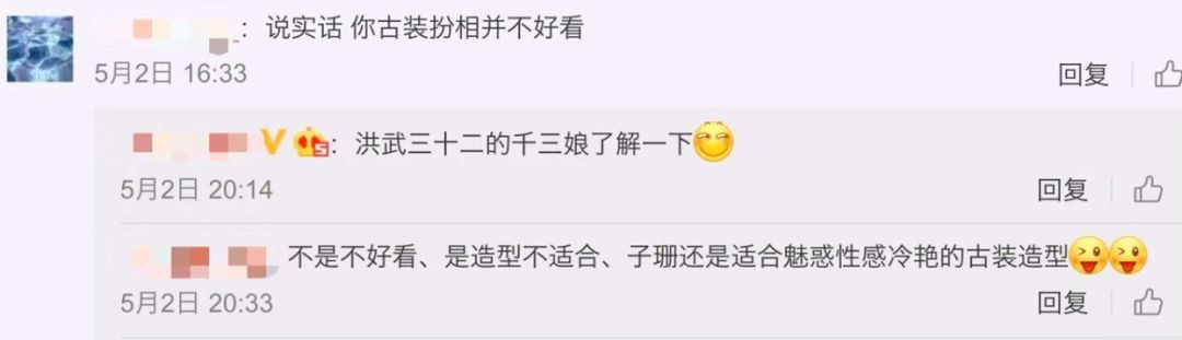 几个月前她在微博晒了自己的古装剧照,也被吐槽“造型不合适”。