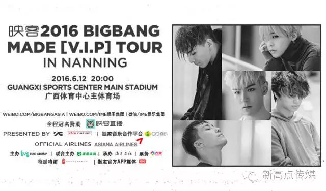 激动!BIGBANG巡演6.12南宁开唱!!!6月12日晚8时,“映客2016BIGBANGMADE「V.I.P」TOUR”南宁站将在广西体育中心体育场火热开演。获得此消息的南宁的小伙伴更是在近期奔走相告,分享着这个令人激动的消息,而此次BIGBANG更是首次空降南宁。下次来南宁的时间还遥遥无期,粉丝调侃道“太激动了,南宁的VIP们千万别犹豫,吃土也要去!”之前一直有消息称BIGBANG南宁站的安排定于七月,而此次正式公布的时间整整提前了一个月,一时间,妹子们纷纷想象着自己的偶像来到南宁的场景,脑补着见到偶像的幸福场面。据悉,此次BIGBANG中国巡演将安排更多BIGBANG和VIP之间交流,增加游戏节目的互动性,让更多VIP有机会真正的与BIGBANG的五位成员面对面接触。 购票渠道2016 BIGBANG MADE [V.I.P] TOUR IN NANNING时间:2016年6月12日20:00场馆: 广西体育中心体育场票价:¥580、780、980、1280元咨询热线:13407881818注:价格有所调整,请以实际确认为准认准官方售票/谨防假票点击边框编辑视频
