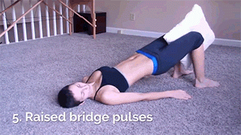 瘦腿操第四步:平躺在地上,双腿夹住枕头,腰腹部臀部用力抬起身体。