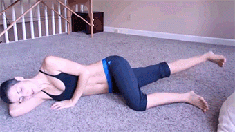 瘦腿操第六步:侧身卧在地上,做抬腿运动。