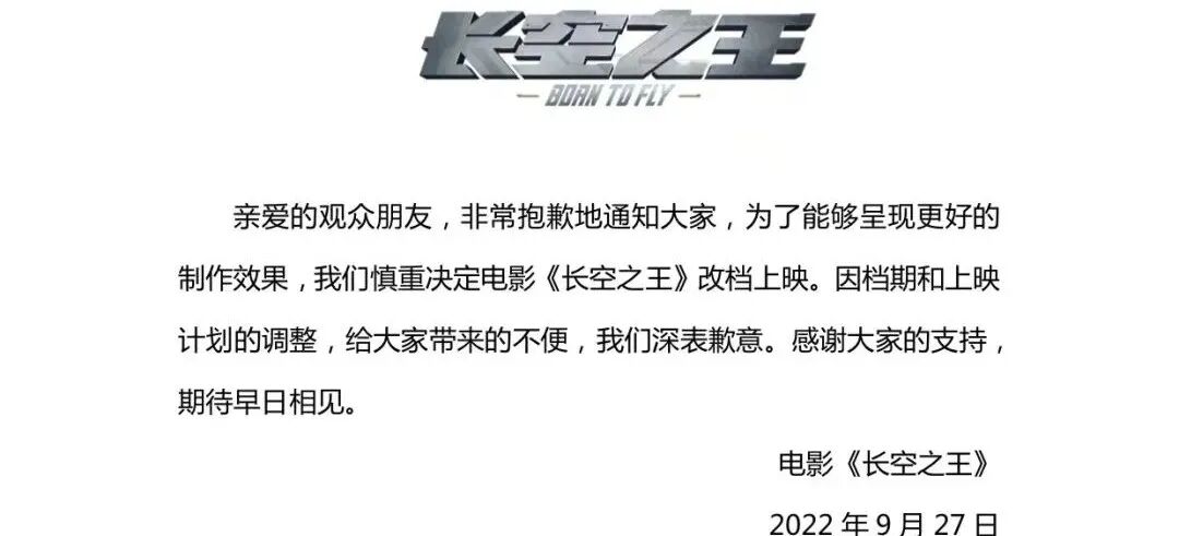 9月27日8点,由王一博、胡军等主演,原定9月30日上映的电影《长空之王》通过官方微博宣布撤出国庆档。