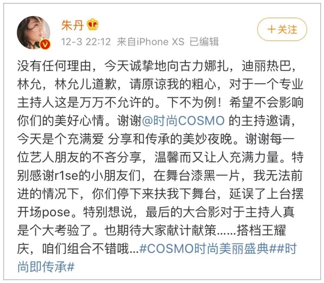 朱丹口误三连,还能吃主持人这碗饭吗? if爱与美好 内地女星 2019-12-05 08:19:44 584 创作不易,用心坚持,欢迎请BaGua喝几杯爱心咖啡!打赏并支持本文 打赏并删除本文 前天晚上,#朱丹口误#冷不丁冲上了热搜,点进去一看,原来是因为她在一个重大时尚活动上,频频叫错人名。把古力娜扎叫成迪丽热巴,对着林允喊允儿,为了救场,又故意把迪丽热巴叫成古力娜扎,口误连连引发巨大争议。热评第一的态度是:这种操作恕我不能理解。此事发生后,朱丹本人连发三条道歉微博,诚恳认错的同时,也表达了自己的懊恼。舆论逐渐分成两派,有部分人觉得,主持人口误在所难免,正视错误,下次改进就行。但有部分人开始质疑,朱丹真的适合吃主持人这碗饭吗?理由是,除了这次失误,之前她在湖南卫视主持《中国最强音》的时候,还把短信通道念成老东家浙江卫视的,导致了重大播出事故。if 姐无法给朱丹下定义,但要想判定一个人到底适不适合吃某碗饭,这几个维度可以考量:一是除了失误,工作是否还有其他亮点。毫无疑问,朱丹是有的。作为主持人来说,朱丹的成绩与实力有目共睹。之前和华少搭档《我爱记歌词》,凭借两人的默契配合,让这档节目爆火成为浙江卫视王牌节目,朱丹也成为浙江卫视的“主持一姐”。救场时刻也不少。之前在爱奇艺尖叫之夜,朱丹邀请唐嫣分享下婚后的甜蜜,但唐嫣走得太快,且一开始没有听到主持人叫她,所以只回头笑了下就直接下台了。朱丹的圆场还是很得体的:唐嫣的笑容绽放出了婚后的甜蜜。二是在这一领域是否愿意投注足够多的时间。朱丹在事业发展前几年,在事业上花的时间可不少。她的工作时间是一个月 30 天,一天 16 个小时。一个星期有四档节目,平均每分钟说话的字数是 300 到 350。在《做家务的男人》里,她坦言在浙江卫视工作期间工作强度非常大,每天除了睡觉之外,几乎都是在舞台上。2012 年,她因为光脚主持引发热议。而实际情况是,当天晚上她 39 度高烧不退,不间断地录了 5 个小时,为防止自己晕倒,才选择在录制间隙,用皮肤直接触地面的方法来降温。因为够拼,她被封为“主持界的拼命三娘”。正是这些年打下的根基,积累的丰富经验,才让她有资格站上大舞台,主持大型晚会。三是自己是不是真的热爱。朱丹学的是播音主持专业,所以当主持人算是对口,但演戏,真是半路出家。可因为热爱,依旧能支撑她吃这碗饭。虽然不是科班出身,但是朱丹十分热爱演戏,她说:现在看到演戏的通告表就兴奋,看剧本都可以不睡觉。 提起演戏的朱丹,眼里全是光,她说,演戏是上帝为她开的一扇窗。 2013 年,拍摄《绣春刀》,打戏很多,对于她来说,非常吃力。朱丹发现自己总是练不好动作,便开始死磕,一遍一遍地试。武术指导都看累了,说,“丹姐,你歇歇吧。”但她只有一句:“不行,再试一次!”在演戏这块上,比起她老公或是其他专业演员,朱丹确实算不上老天爷赏饭吃的那一挂,但热爱所带来的付出,依旧可以让她在这个领域取得自己的成就,依然可以选择吃这碗饭。当然,if 姐说这么多,绝不是替朱丹“洗白”,而是她身上投射出了很多我们普通职场人会面临的焦虑。事业发展正顺时,突然遭遇重创;职业生涯里屡屡犯错,对自我能力产生极大怀疑;遇到了自己并不那么擅长,但真心热爱的事情,不知道要不要坚持;于是总忍不住问完苍天问大地:我到底适不适合吃这碗饭?《中国经济生活大调查》与智联招聘的一项联合调查结果显示,职场人越年轻越焦虑,最焦虑的是 90 后,占比 54%。而且据调查,“加班焦虑”占比 85%,“晋升焦虑”占比 61%。对未来方向的迷茫,自我职业规划不清晰导致的心慌,一旦没有得到妥善处理,便会成为你职业生涯发展前进的绊脚石。if 姐公司也有很多人,曾经怀疑过自己到底适不适合吃这碗饭,不知道自己坚持的理想是否正确,但后来,都凭借自己的能力将其化解了。如今,她们找到了自己的热爱,边“享受”,边赚钱,边成长。马上年底了,很多人都在寻思着跳槽或是转行,今天,if 姐将她们的经验分享出来,希望能给大家一些启发。工作半年新人的自我否定与自我怀疑如何克服?大家好,我是 cj,作为一个实习了 7 个月,现在正式工作了半年的职场小白,自我否定和自我怀疑一度是我生活的常态。实习的时候,工作环境轻松,简直是如鱼得水,但来了 if 之后,才知道什么是高标准严要求,公司随便拎一个人出来都很“能打”,实力强到让人害怕。加上自己是 98 年的,无论是年龄还是经验,都觉得自己比别人弱,就特别希望能迎头赶上。但在这个向别人看齐的过程中,我陷入了深深的自我怀疑,简而言之:太难了!分分钟被虐哭!一是因为自己肚子里没东西,遇到难的选题就不想动笔,会觉得特别丧。二是没做过的事情,会有点害怕去做,但越害怕就越慢,越慢就越挨批,越挨批就越害怕,慢慢地形成了一个恶性循环。三是同样的工作,同事只要花两小时,我可能需要花一整天,一对比就觉得自己无比菜,特别难受。哭过、崩溃过、想破罐子破摔过,可从没想过放弃,支撑我一直走下来的几点经验可以分享给大家。首先,大方向要确定,自己是否真的喜欢这个工作。我对自己的职业规划,一直是建立在文字基础上的,所以无论多难,我都只是怀疑自己到底能不能把这件事做好,但从来没想过我要换跑道。而且我知道自己喜欢那种有挑战性的工作,跟弹簧一样,压得越紧,