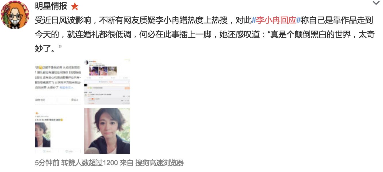 不明真相的李小冉被水军拖下水还反抗了一下,忽然发现自己是挡枪的,打算悄悄匿了,没想到网友又喷人家是蹭热度!
