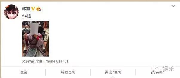 19日,陈赫晒微博,称自己是A4小脸,引网友吐槽。