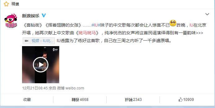 IU在中国的人气非常高,作为韩国女歌手来到中国开见面会的她,会主动学唱中文歌。