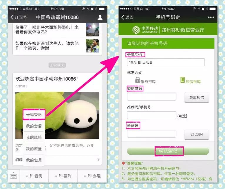 点击菜单“和.查询——号码登记”进入绑定页面,输入相关信息,即可成功绑定。不记得服务密码的亲还可选择短信密码哦~