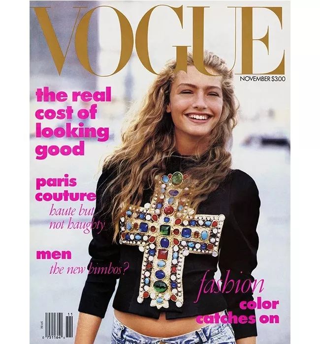 1988年属于Anna Wintour 的第一本《VOGUE》杂志封面,她就破天荒地让模特穿着Christian Lacroix 的上衣搭配50美金的牛仔裤,封面大标题是“the real cost of looking good”,看来这个态度章小姐学到了。