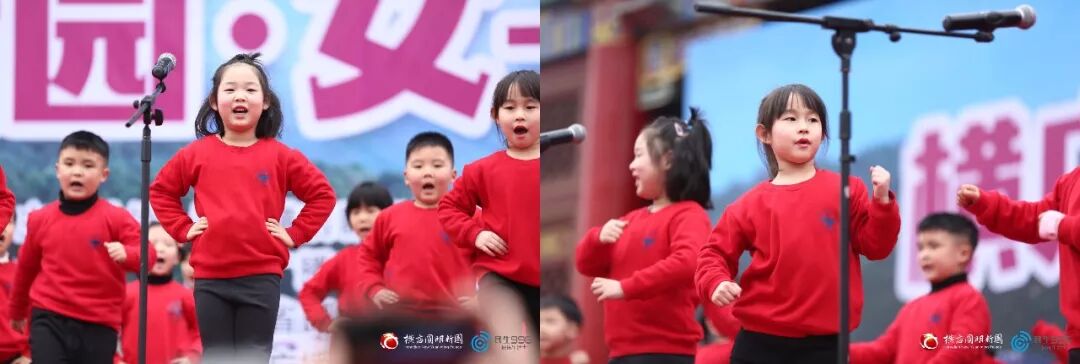 浙江少儿广播合唱团的小朋友们现场演唱《森林的音乐家》、《健康歌》,天籁童声回荡在初春的横店圆明新园。