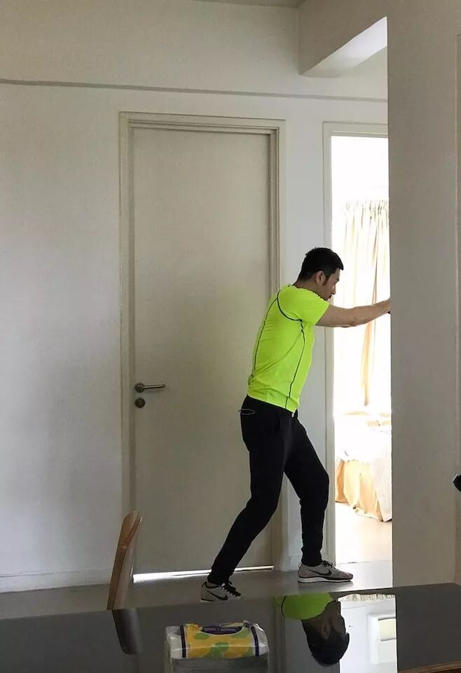 李光洁身穿荧光绿短T认真专注听教练讲解,练习动作。网友评论:“看样子像在国外接受训练,认真起来的洁哥超有范!”