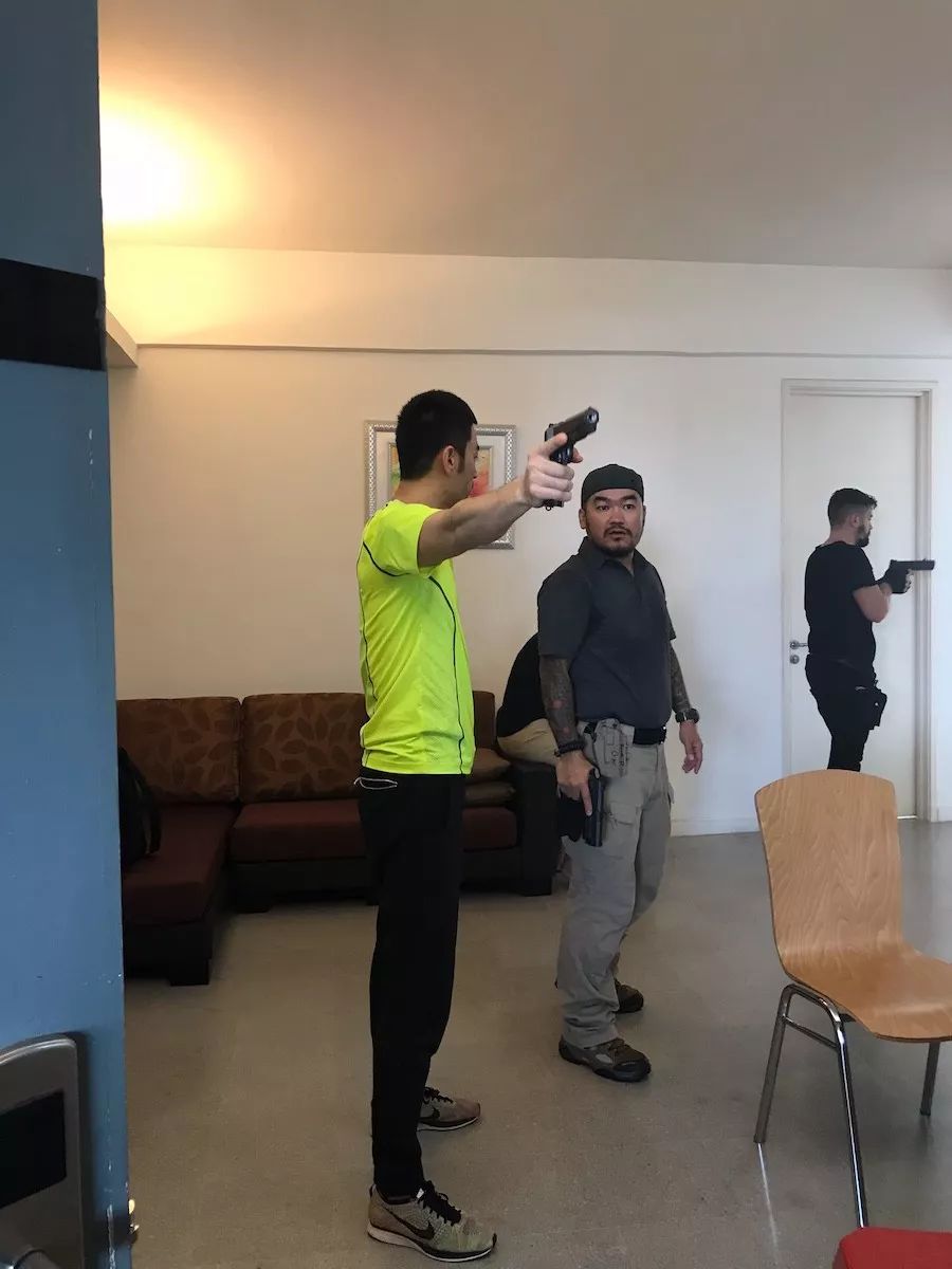 照片中花臂男士一身制服装扮疑似专业枪械教练,旁边一起练习的还有外国友人。
