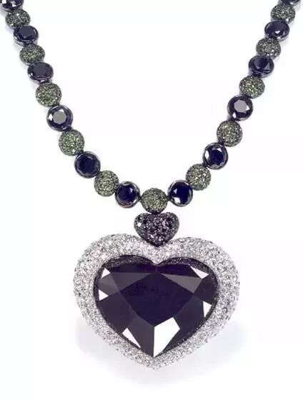 这颗心形的钻石是一条项链的中心部件,项链由58.77克拉的较小的黑色钻石、378颗白色钻石和14.1克拉的墨绿色石榴石组成,用铂金作底座。