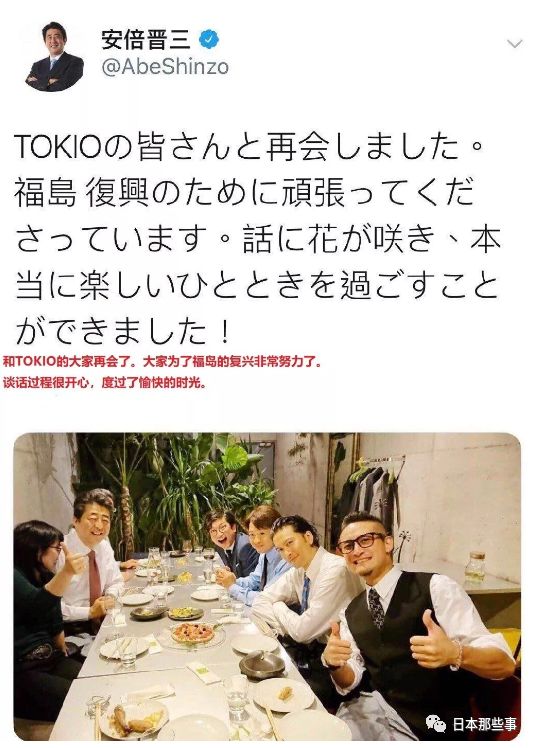 前段时间日本首相安倍晋三晒出了一张自己sns上的照片。令人意外的是,这次和他共进晚餐的竟然是t团4人。为了表彰t团在对福岛县震后复兴工作的积极作用。