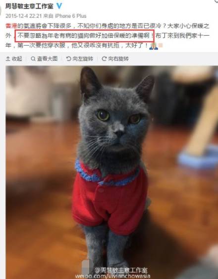 周慧敏曾经在微博上晒出自家喵之一布丁的照片,并号召大家不要忽略年老有病的猫咪,气温下降要做好加倍保暖的准备。