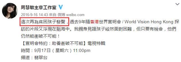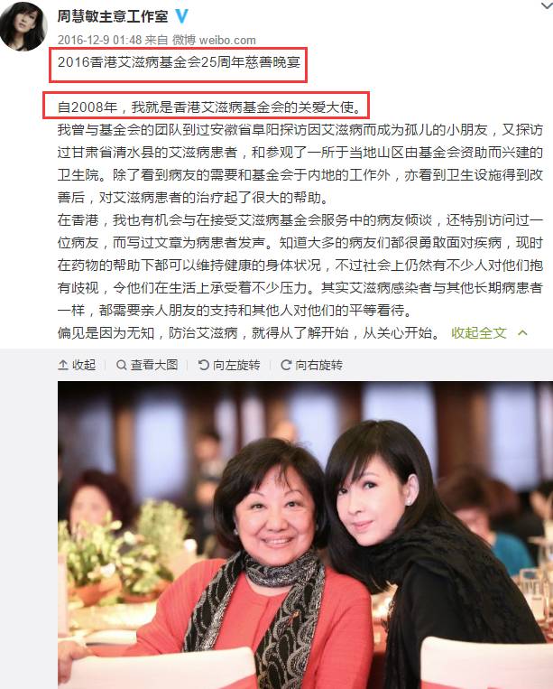 平日里常常可以看到周慧敏更新一些有关慈善的宣传。