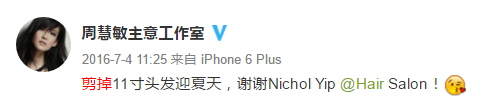 去年夏天,多年以长发形象示人的周慧敏来了个“大变身”,将头发剪短,宛如学生妹。她发微博晒出照片,还配文称剪掉11寸长发迎接夏天。
