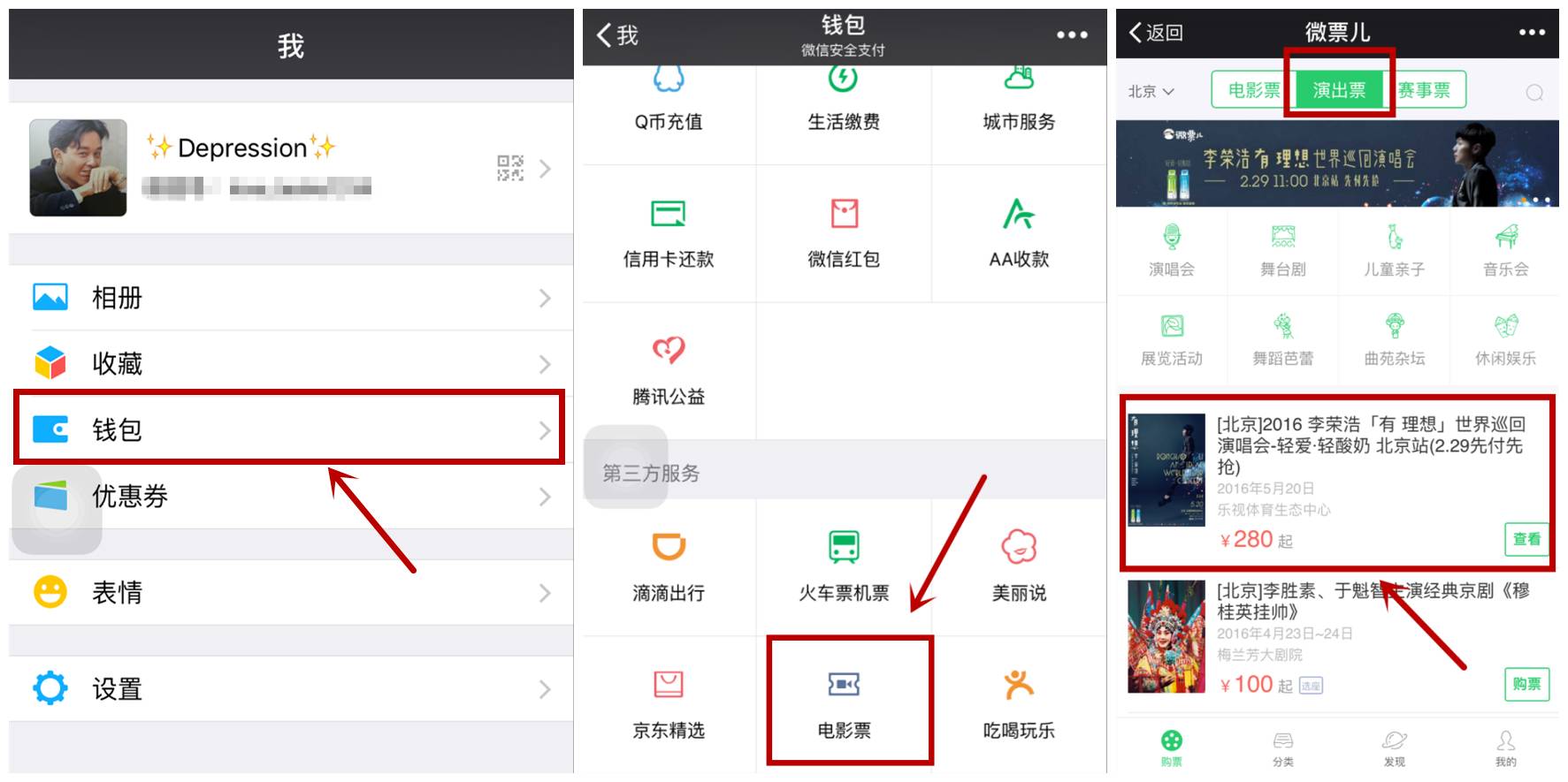 点击进入微信“钱包”,选择“电影票”,进入北京站“演出票”,即可看见预付链接进行购买。