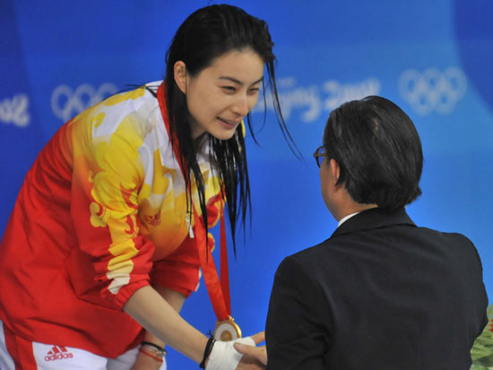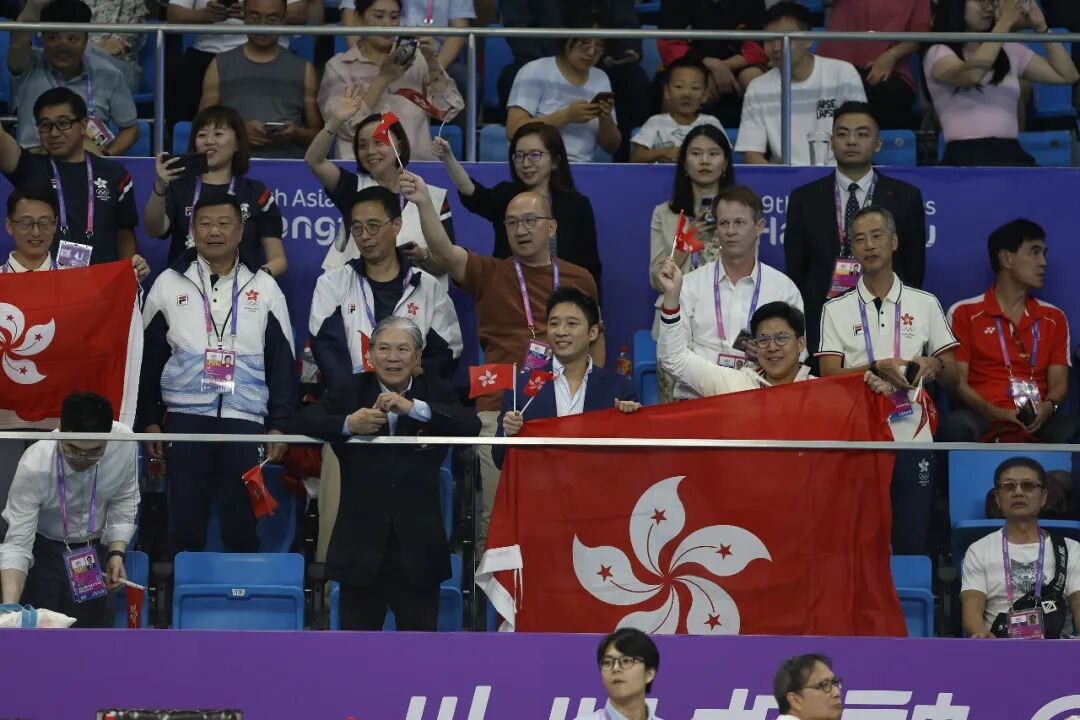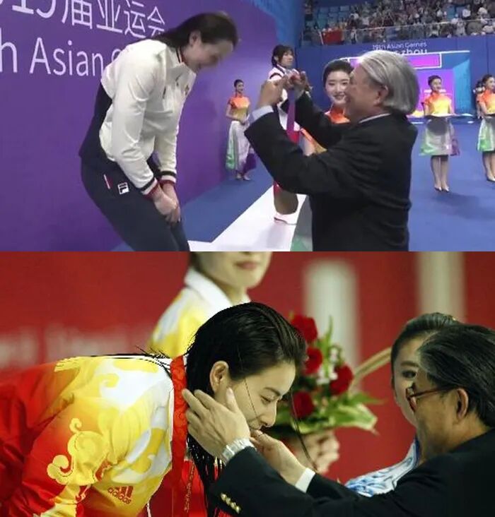 而霍震霆为拿下中国香港队亚运游泳首金的何诗蓓颁奖的画面,也让人一秒想起郭晶晶。