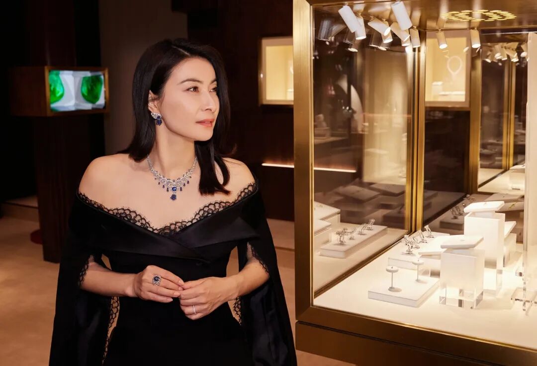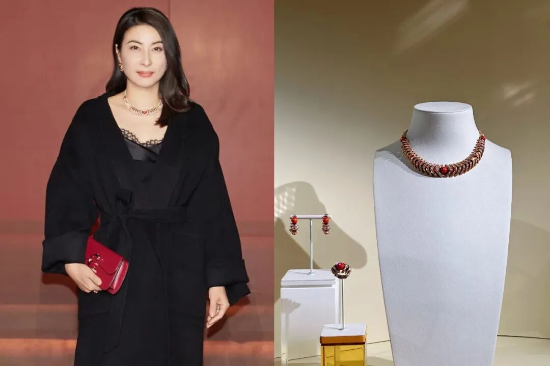 开头提到的在北京出席卡地亚高珠展,一身黑色露肩款POEM礼服套装,搭配卡地亚LE VOYAGE RECOMMENCÉ高级珠宝系列KURINJI项链及耳环,率性又干练。