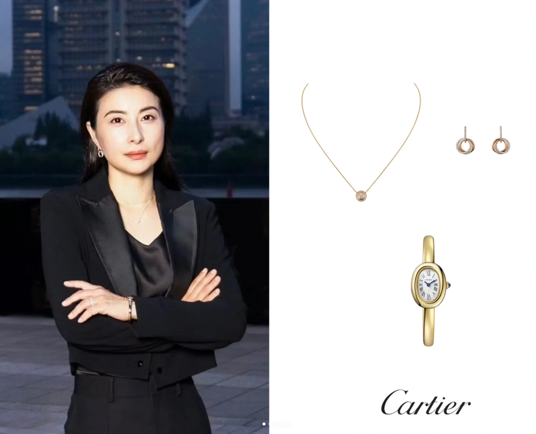 郭晶晶算是卡地亚的“真爱粉”,戴过不少卡地亚单品。比如这套Trinity系列耳环、Cartier d‘Amour系列项链,以及Baignoire系列腕表,简洁经典。
