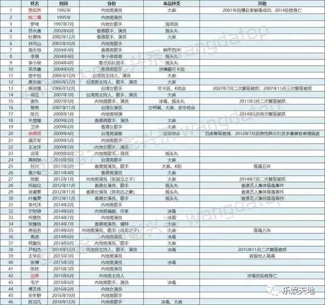之后,更是一个接一个的名字出现在“毒”的新闻当中!苏永康、杜德伟、井冈山、满文军、孙兴、莫少聪、满文军、张默、李代沫、宁财神、柯震东、房祖名、毛宁、尹相杰、王学兵、傅艺伟、宋冬野等等等等!从1997年到2018年刚20年的时间内,多达46名明星相继吸毒被抓!平均每年就会有2个明星被曝光出吸毒的丑闻!令人触目惊心!
