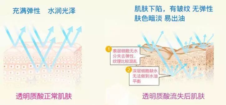 而透明质酸的流失,皮肤会失去储水能力,就会出现肌肤松弛、下垂、皱纹等老化现象啦~