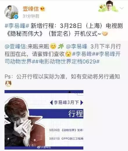 李易峰官宣确认将出演电视剧《隐秘而伟大》,出演男主顾耀东,并于3月28日出席电视剧开机仪式,终于能看到新鲜草了!