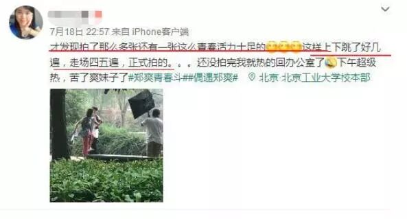 有网友就亲自见证了郑爽拍戏的辛苦,写道:“还没拍完我就热的回办公室了,下午超级热,苦了爽妹子了。”