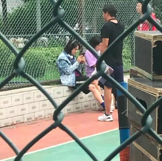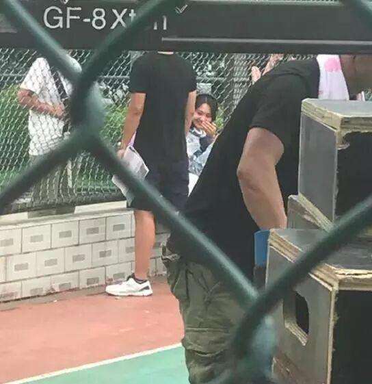 随后她坐在篮球场上与身边的人热聊,笑起来特别甜,看来心情不错。