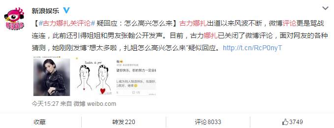 最近有不少细心网友发现古力娜扎关闭了微博评论,正在大家纷纷猜想原因时,她发微博解释称自己怎么高兴怎么来,大有不在乎网络上的言语攻击之势。