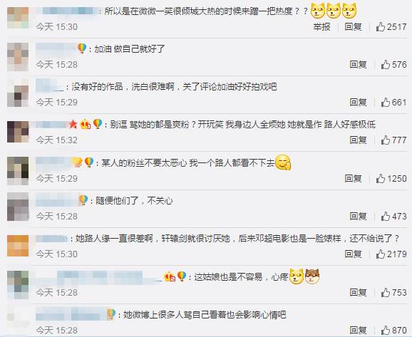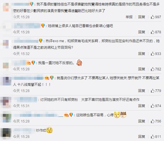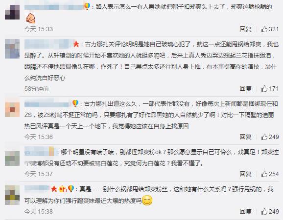 此次,古力娜扎关闭微博评论上了头条,大部分网友依旧吐槽她,其中最近凭借《微微一笑很倾城》再度走红的郑爽莫名躺了枪,节选微博部分评论: