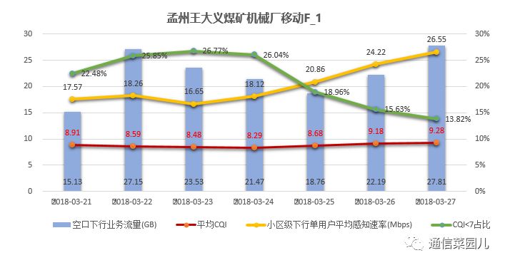 (二)沃网络指标:从沃网络提取孟州王大义煤矿机械厂移动F_1最近5天的相关指标,从数据来看,同时参照省公司CQI专项优化的问题小区定义: