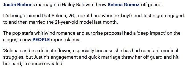 他们报道说Selena Gomez因为前男友如此快的速度跟Haily Baldwin结婚,让她受到了很大的冲击…并且现在不堪重负,再度入院。