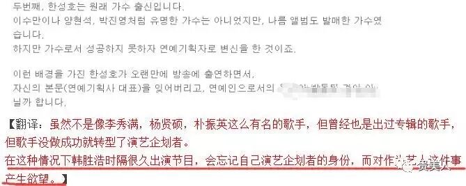 二是代表韩胜浩本来就是歌手出身,在这种情况下韩胜浩时隔很久出演节目,会忘了自己演艺企划者的身份,而对艺人这件事产生欲望....