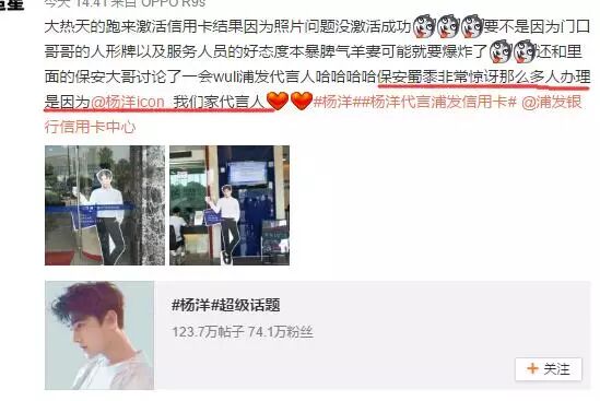 “杨洋”现身浦发信用卡网点 粉丝号召力惊人连保安都惊叹 杨洋资讯吧 内地男星 2017-09-18 21:34:02 441 创作不易,用心坚持,欢迎请BaGua喝几杯爱心咖啡!打赏并支持本文 打赏并删除本文 今日有羊毛去到浦发银行网点激活信用卡,在办理点遇到我们帅气的代言人立牌,而且还是两个哦!这位羊毛和银行的保安聊天时,得知有很多人是因为代言人去办理信用卡的,惊人的号召力连保安都惊讶,杨洋这商业价值不得不服。 创作不易,用心坚持,欢迎请BaGua喝几杯爱心咖啡!打赏并支持本文 打赏并删除本文 感谢您的支持鼓励,我会继续努力的!文章地址:用户邮箱:打赏金额:USDT 请输入数字点击”去打赏“,即可进行打赏支持本文章哦 杨洋 About the Author 杨洋资讯吧 功能介绍:每天推送杨洋icon最新资讯,和我们一起来守护咩咩吧!微博@杨洋资讯吧 Related Posts “杨洋”现身浦发信用卡网点 粉丝号召力惊人连保安都惊叹 2017-09-18 21:34:02 杨洋插画集 2016-10-27 21:25:27 杨洋代言小盘点 2016-10-20 10:57:55 发表评论